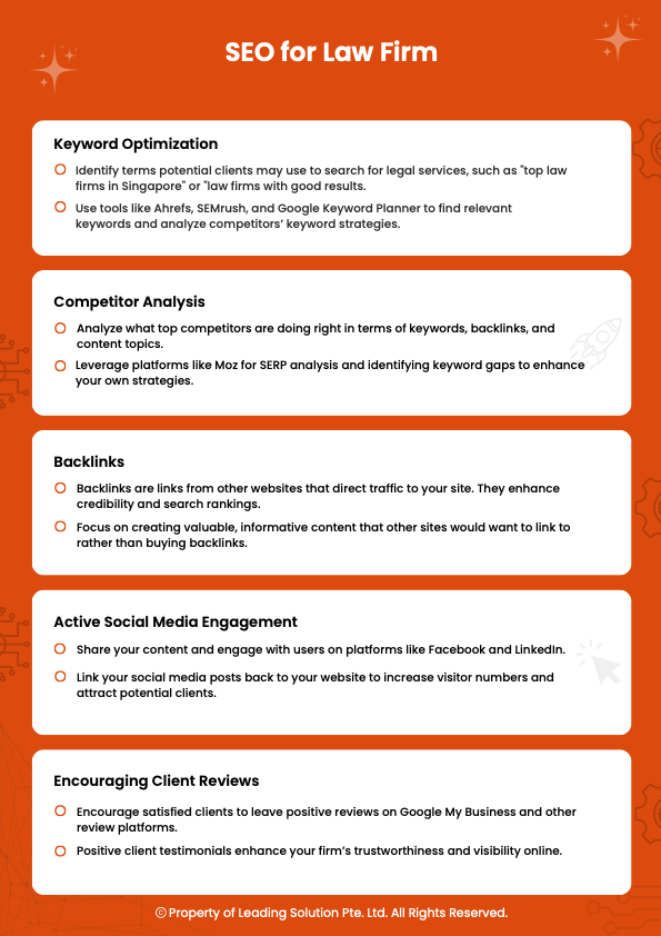 Keyword research is the starting point for optimising your law firm’s website. You need to find specific keywords related to your legal services. Whether people are searching for “top law firms in Singapore” or “Law firms with good results in Singapore, you need to be in the place.”